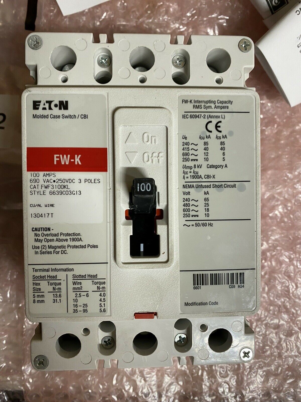 FWF3100KL Eaton 100 Amp 3 Pole Circuit Breaker Cutler Hammer 690V (New in Box)